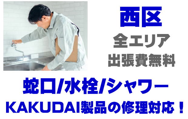 西区で水栓メーカーKAKUDAIの修理業者をお探しなら当社までお気軽にお問い合わせください。蛇口の水漏れ、シャワーの故障などカクダイ製に関するトラブルなら何でもご相談ください。